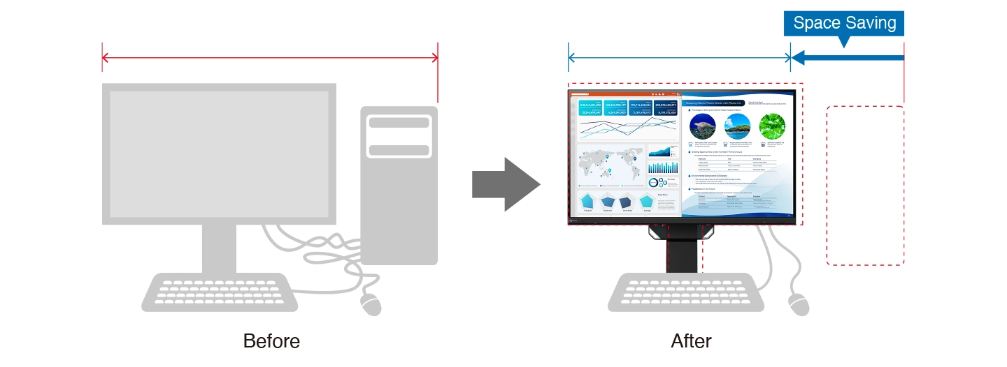 Μπορείτε εύκολα να ανοίξετε πολλαπλά παράθυρα για αποτελεσματική εργασία. Επιπλέον, ενσωματώνει “frameless” σχεδιασμό με πλάτος μόλις 611,7 mm και μια νέα ευπροσάρμοστη βάση για μέγιστη εργονομία στον χώρο σας.